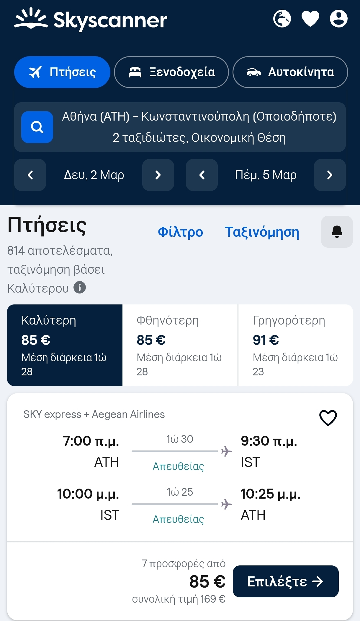 Στο βασικό ναύλο της Sky express περιλαμβάνεται τσάντα πλάτης και χειραποσκευή ενώ της Aegean περιλαμβάνεται τσάντα πλάτης ή χειραποσκευή. Υπάρχουν κι άλλοι συνδυασμοί πτήσεων, αλλά αυτός μεγιστοποιεί το χρόνο σας στην Κωνσταντινούπολη.