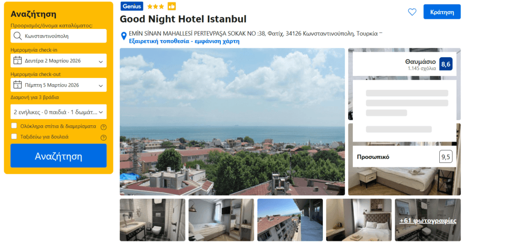 Για τη διαμονή σας εντοπίσαμε το ξενοδοχείο 3* Good Night, που βρίσκεται στην περιοχή της Αγίας Σοφίας και κοντά σε πολλά αξιοθέατα της Κωνσταντινούπολης. Tο κόστος ενός δωματίου 2 ατόμων για 3 βράδια είναι μόλις 77€ ή 89€ με δωρεάν ακύρωση της κράτησης έως 3 μέρες πριν το ταξίδι. Με μικρές διαφορές στην τιμή μπορείτε να κάνετε αναβάθμιση δωματίου. Η αξιολόγησή του στην booking είναι 8.6/10.