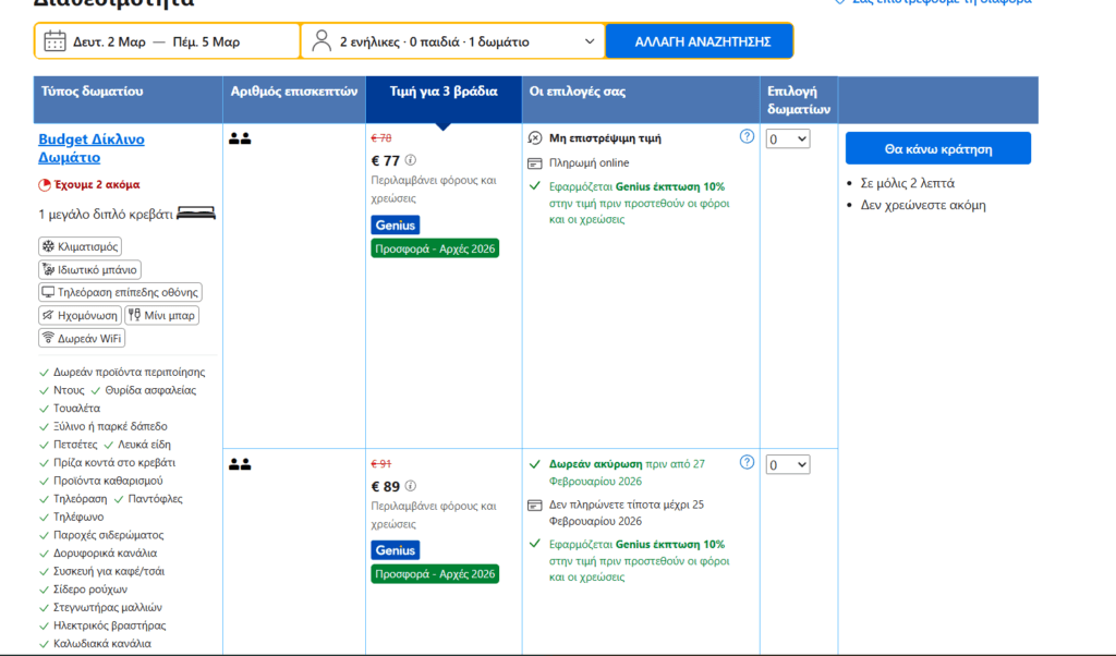 - Η τελική τιμή προκύπτει για κράτηση σε δίκλινο δωμάτιο, χωρίς αυτό να σημαίνει ότι δεν μπορείτε να κάνετε κράτηση για μεγαλύτερα ή περισσότερα δωμάτια, αν είστε περισσότερα άτομα.