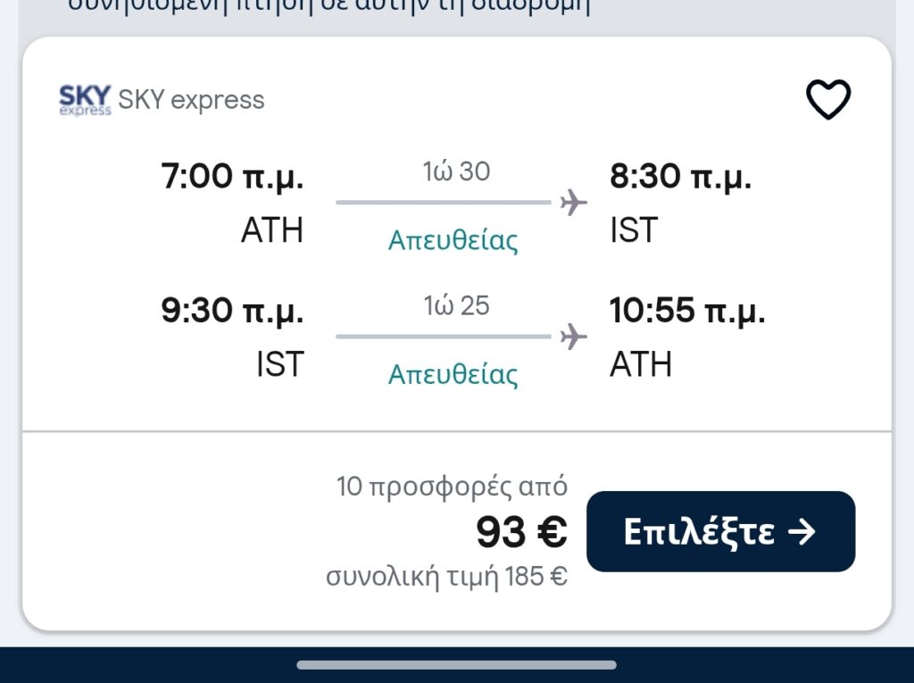 Στο βασικό ναύλο της sky express περιλαμβάνεται τσάντα πλάτης και χειραποσκευή. Υπάρχουν κι άλλοι συνδυασμοί πτήσεων, αλλά αυτός μεγιστοποιεί το χρόνο σας στην Κωνσταντινούπολη.