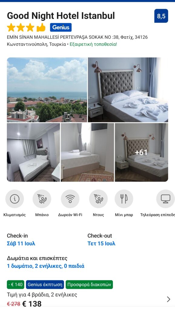 Για τη διαμονή σας εντοπίσαμε το ξενοδοχείο 3* Good Night, που βρίσκεται στην περιοχή της Αγίας Σοφίας και κοντά σε πολλά αξιοθέατα της Κωνσταντινούπολης. Tο κόστος ενός δωματίου 2 ατόμων για 4 βράδια είναι μόλις 138€ ή 160€ με δωρεάν ακύρωση της κράτησης έως 3 μέρες πριν το ταξίδι. Με μικρές διαφορές στην τιμή μπορείτε να κάνετε αναβάθμιση δωματίου. Η αξιολόγησή του στην booking είναι 8.5/10.