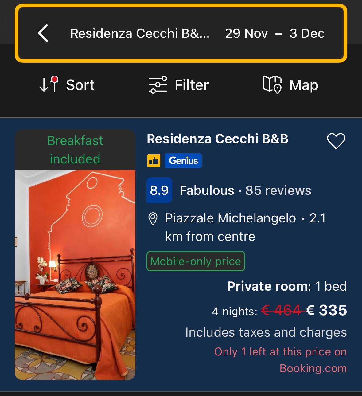 Για τη διαμονή σας στη Φλωρεντία έχουμε εντοπίσει το κατάλυμα Residenza Cecchi B&B, που βρίσκεται κοντά στο κέντρο της Φλωρεντίας. Από την εφαρμογή της booking, που προσφέρει καλύτερη τιμή, για 4 βράδια, το δίκλινο με πρωινό κοστίζει 335€ ή 367€ με δωρεάν ακύρωση της κράτησης έως 3 μέρες πριν το ταξίδι. Η αξιολόγησή του στην booking είναι 8.9/10.