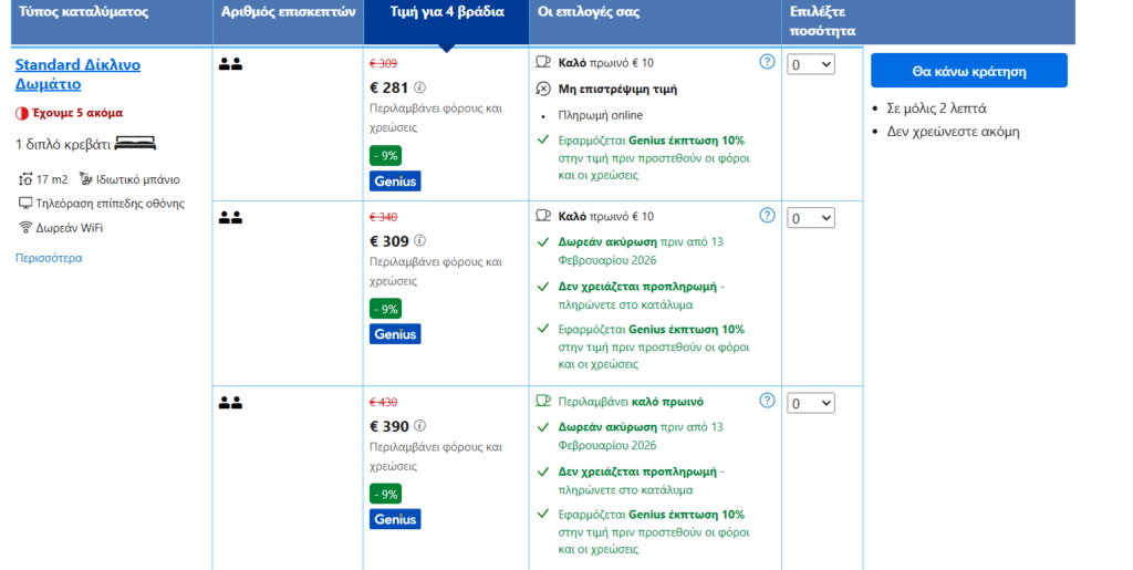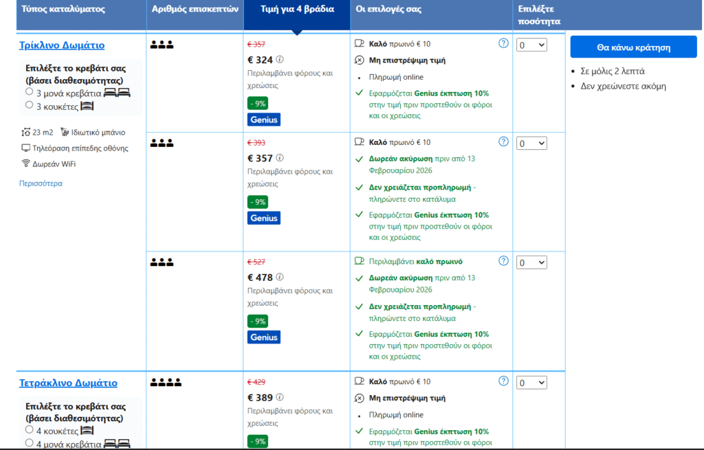 *Για να σας εμφανίζεται η τιμή που βλέπουμε, πρέπει να κάνετε σύνδεση στο site της Booking. Είναι δωρεάν και γίνεται απευθείας μέσω gmail.