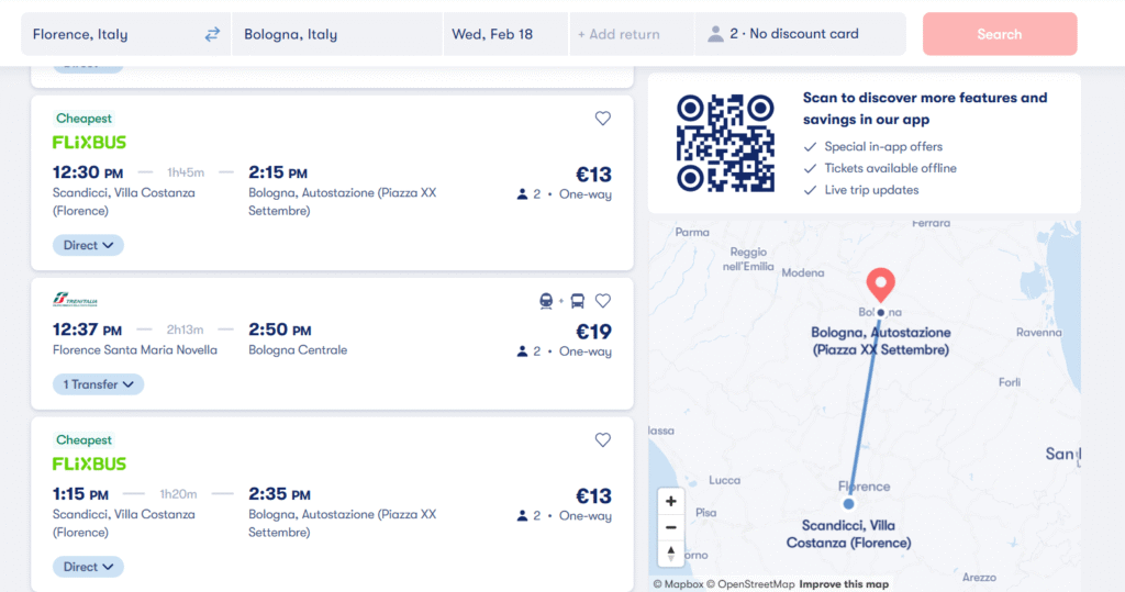 Για την επιστροφή, σας προτείνουμε να κλείσετε λεωφορείο ή τρένο από το κέντρο της Φλωρεντίας προς το κέντρο της Μπολόνιας. Να γυρίσετε στη Μπολόνια και την επόμενη ημέρα να πετάξετε από το αεροδρόμιο. Τα εισιτήρια είναι πολύ οικονομικά τύπου 10-30€ για 2 άτομα, αναλόγως των ωρών, των εταιριών κοκ. Για να γλιτώσετε χρόνο, σας προτείνουμε το παρακάτω δρομολόγιο λεωφορείου που είναι 1:15 για να έχετε αρκετό χρόνο στη Μπολόνια, κοστίζει 13€ για 2 άτομα. Αν κλείσετε online από omio.com, όπως σας προτείνουμε, προσέξτε να έχετε σαν αφετηρία το σταθμό Santa Maria Novella που είναι ο πιο κοντινός στο κέντρο της Φλωρεντίας!