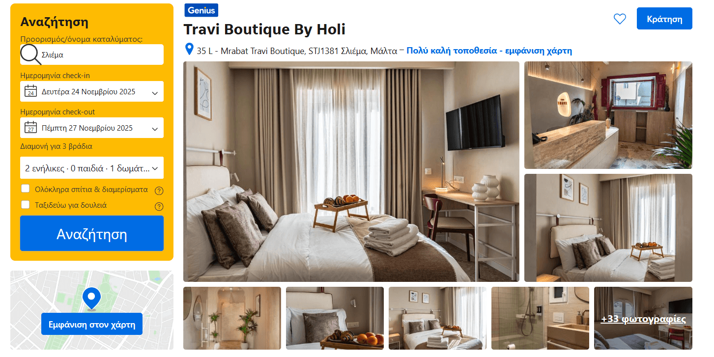 Για τη διαμονή σας έχουμε εντοπίσει το κατάλυμα Travi Boutique by Holi, που βρίσκεται στη Σλιέμα. Γενικά, η Σλιέμα και η Βαλέττα είναι οι ιδανικές περιοχές για να μετακινήστε εύκολα και γρήγορα σε ολόκληρη τη Μάλτα με τις δημόσιες συγκοινωνίες. Ωστόσο, η Σλιέμα είναι αρκετά πιο οικονομική από τη Βαλέττα, την πρωτεύουσα της Μάλτας. Για 3 βράδια, το δίκλινο κοστίζει μόλις 121€ ή 135€ με δυνατότητα δωρεάν ακύρωσης της κράτησης έως 1 βδομάδα πριν το ταξίδι. Η αξιολόγησή του στην booking είναι 8.6/10.