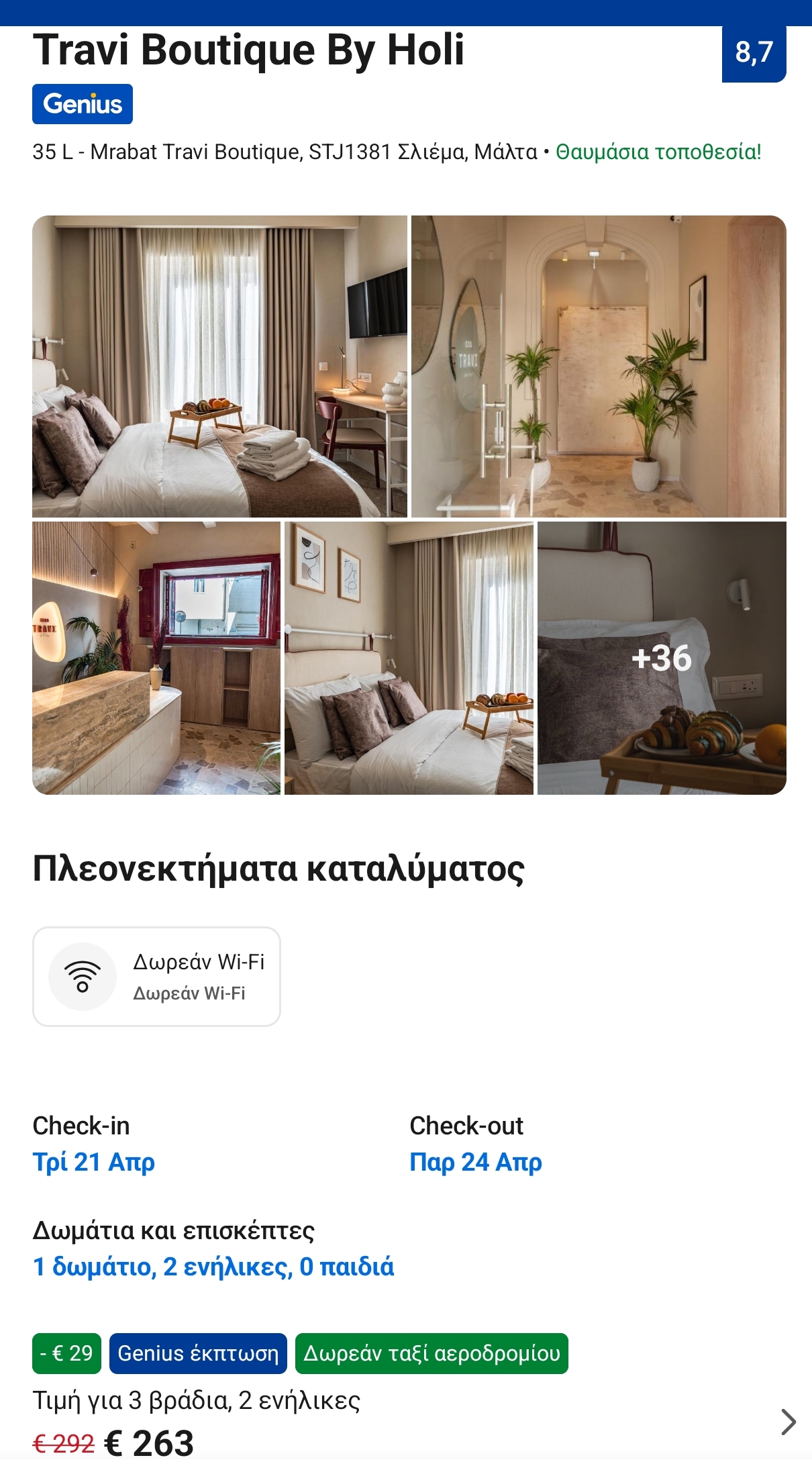 Για τη διαμονή σας έχουμε εντοπίσει το κατάλυμα Travi Boutique by Holi, που βρίσκεται στη Σλιέμα. Γενικά, η Σλιέμα και η Βαλέττα είναι οι ιδανικές περιοχές για να μετακινήστε εύκολα και γρήγορα σε ολόκληρη τη Μάλτα με τις δημόσιες συγκοινωνίες. Ωστόσο, η Σλιέμα είναι αρκετά πιο οικονομική από τη Βαλέττα, την πρωτεύουσα της Μάλτας. Στην εφαρμογή booking, για 3 βράδια, το δίκλινο κοστίζει μόλις 263€ ή 226€ με δυνατότητα δωρεάν ακύρωσης της κράτησης έως 1 βδομάδα πριν το ταξίδι. Η αξιολόγησή του στην booking είναι 8.7/10.