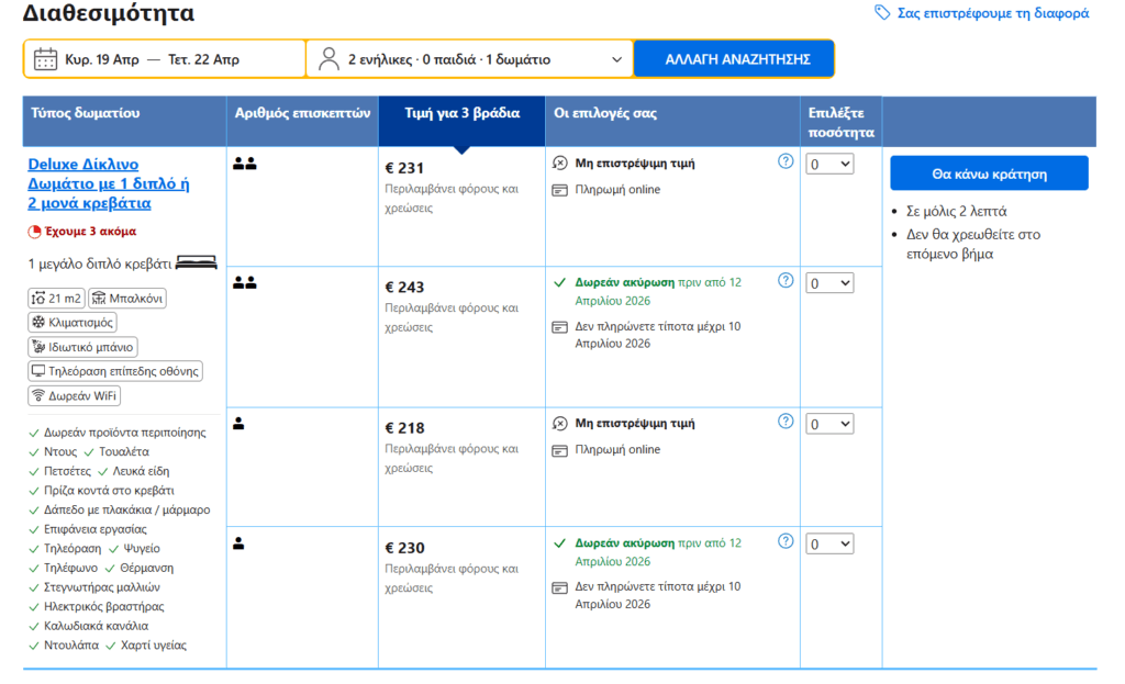 *Για να σας εμφανίζεται η τιμή που βλέπουμε, πρέπει να κάνετε σύνδεση στο site της Booking. Είναι δωρεάν και γίνεται απευθείας μέσω gmail.