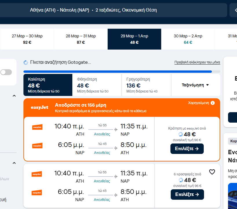 Μπείτε στο site της Skyscanner κι αναζητήστε τις πτήσεις όπως φαίνονται στο screenshot: