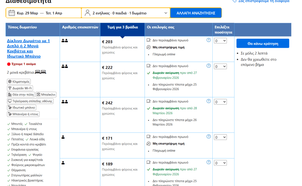 - Η τελική τιμή προκύπτει για κράτηση σε δίκλινο δωμάτιο, χωρίς αυτό να σημαίνει ότι δεν μπορείτε να κάνετε κράτηση για μεγαλύτερα ή περισσότερα δωμάτια, αν είστε περισσότερα άτομα.
