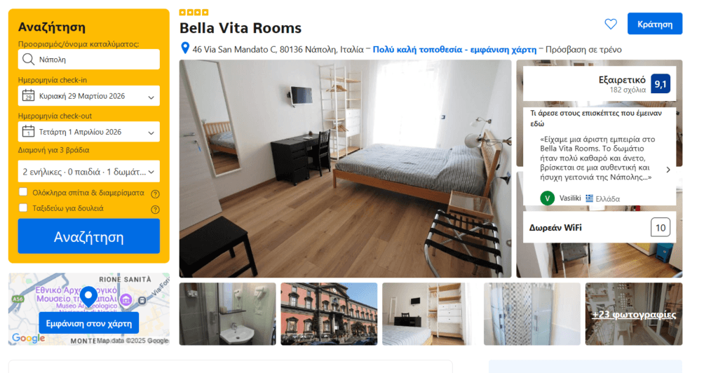 Για τη διαμονή σας εντοπίσαμε το κατάλυμα Bella Vita, που βρίσκεται σε μια ήσυχη και ασφαλή γειτονιά της Νάπολης, σχετικά κοντά στο κέντρο, με εύκολη πρόσβαση στο μετρό της πόλης. Το δίκλινο για 3 βράδια κοστίζει 203€ ή 222`€ με δωρεάν ακύρωση της κράτησης έως 1 μήνα πριν το ταξίδι. Η αξιολόγηση του καταλύματος στην booking είναι 9,1/10.