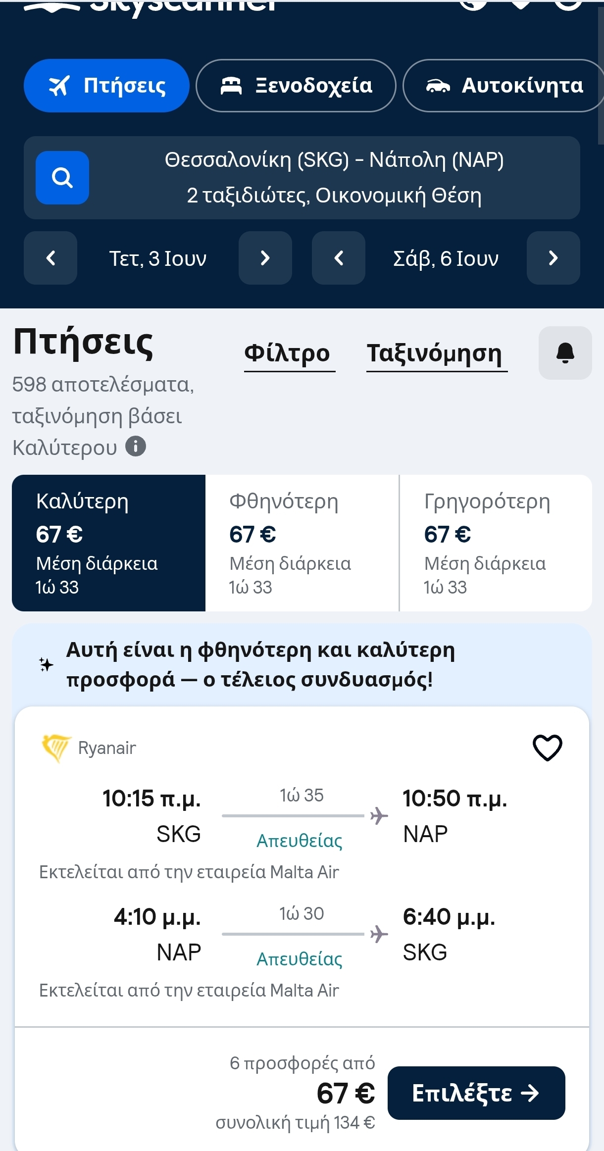 Μπείτε στο site της Skyscanner κι αναζητήστε τις πτήσεις όπως φαίνονται στο screenshot: