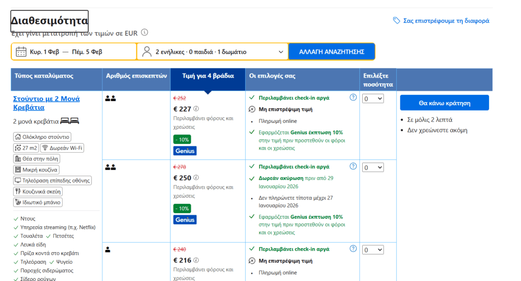 - Η τελική τιμή προκύπτει για κράτηση σε δίκλινο δωμάτιο, χωρίς αυτό να σημαίνει ότι δεν μπορείτε να κάνετε κράτηση για μεγαλύτερα ή περισσότερα δωμάτια, αν είστε περισσότερα άτομα.