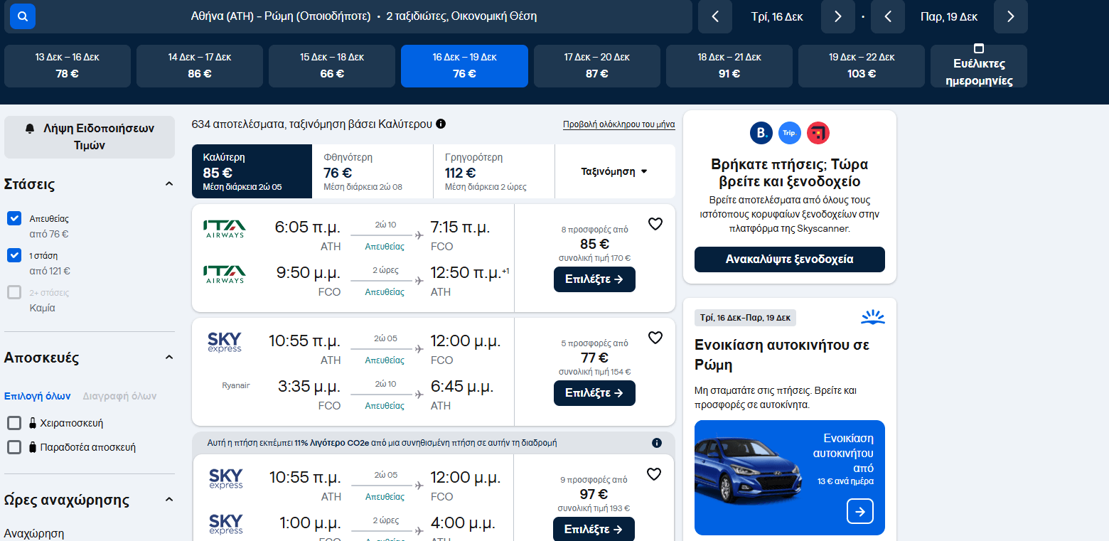 Από το site της Skyscanner αναζητήστε τις πτήσεις όπως φαίνονται στο screenshot: