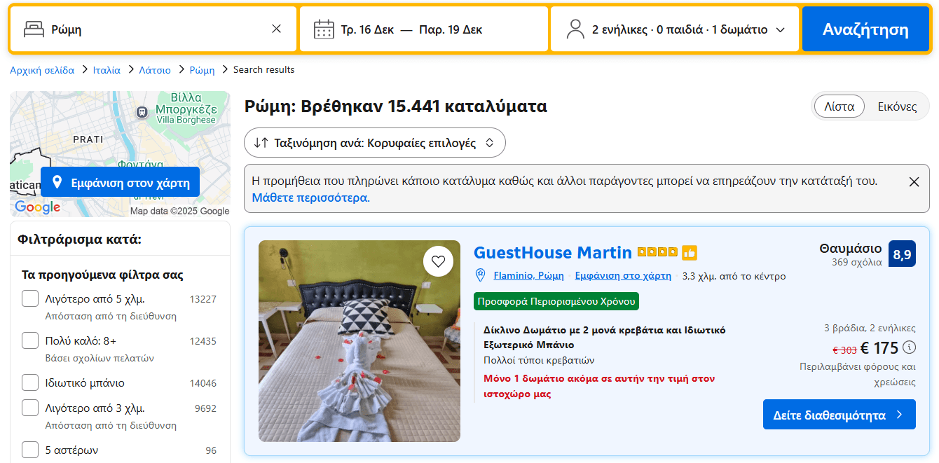 Για τη διαμονή σας στη Ρώμη προτείνουμε το κατάλυμα Guesthouse Martin, που βρίσκεται στην περιοχή Flaminio, μια ήσυχη γειτονιά κοντά στο κέντρο της Ρώμης, με εύκολη πρόσβαση στις συγκοινωνίες. Για 3 βράδια, το δίκλινο κοστίζει 175€. Η αξιολόγηση του καταλύματος στην booking είναι 8.9/10.