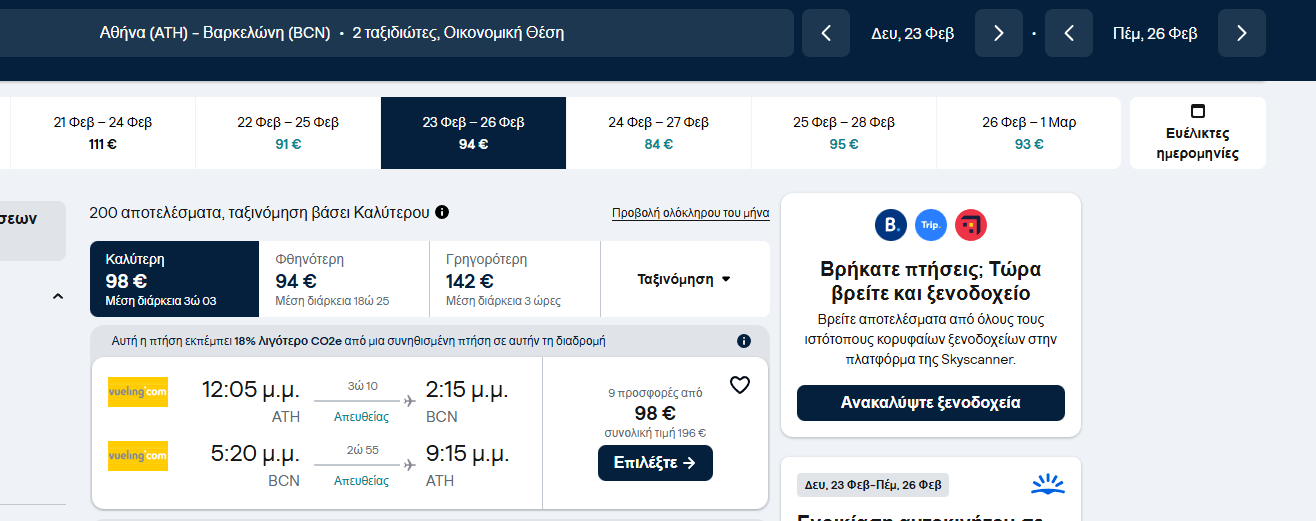 Η συνολική τιμή είναι 196€ με επιστροφή για δύο άτομα με Vueling.