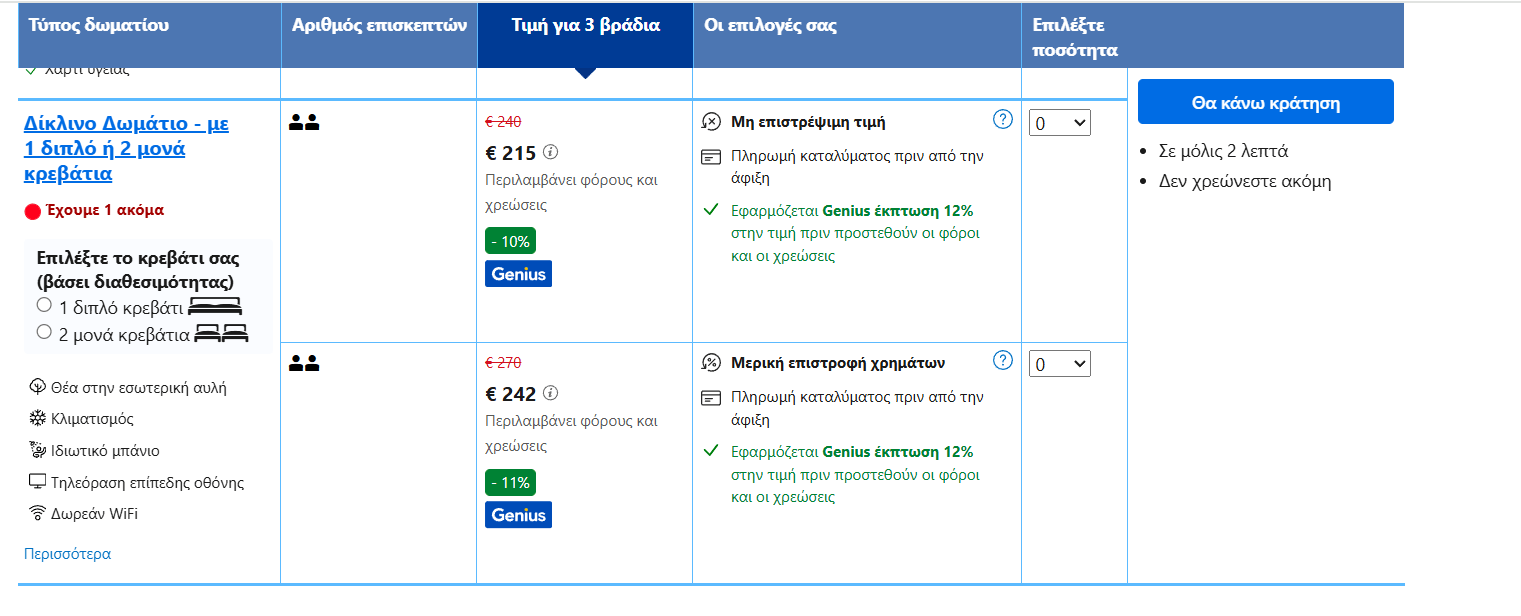 *Για να σας εμφανίζεται η τιμή που βλέπουμε, πρέπει να κάνετε σύνδεση στο site της Booking. Είναι δωρεάν και γίνεται απευθείας μέσω gmail.
