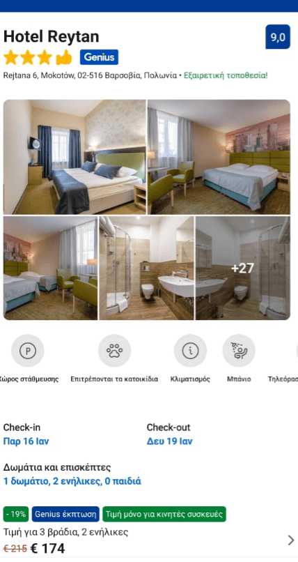 Για τη διαμονή σας στην Βαρσοβία εντοπίσαμε τα ξενοδοχείο 3* Hotel Reytan. Δεν βρίσκεται στο κέντρο της Βαρσοβίας, ούτε πολύ μακριά βέβαια, με εύκολη πρόσβαση στις συγκοινωνίες για το κέντρο της Βαρσοβίας. Από την εφαρμογή της booking που προσφέρει καλύτερη τιμή, καθώς για 3 βράδια το κόστος ενός δίκλινου δωματίου είναι 174 ευρώ με δωρεάν ακύρωση έως 2 ημέρες πριν το ταξίδι με δύο μονά κρεβάτια 183€ με διπλό κρεβάτι. Η αξιολόγησή του είναι 9/10.