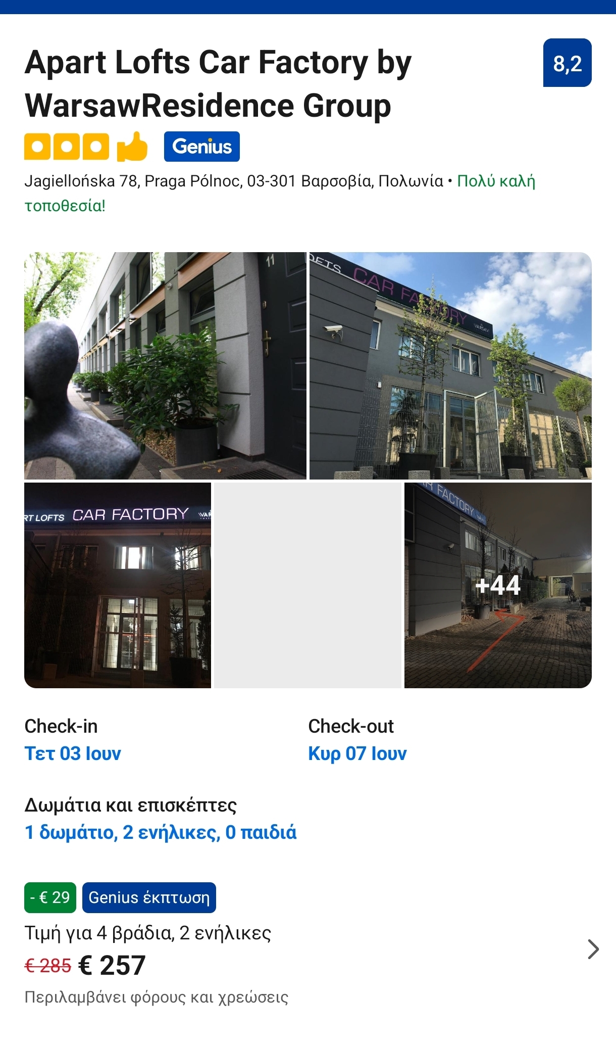 Για τη διαμονή σας στην Βαρσοβία εντοπίσαμε τα καταλύμματα Apart Lofts Car Factory by WarsawResidence Group. Δεν βρίσκεται στο κέντρο της Βαρσοβίας, ούτε πολύ μακριά βέβαια, με εύκολη πρόσβαση στις συγκοινωνίες για το κέντρο της Βαρσοβίας. Από την εφαρμογή της booking που προσφέρει καλύτερη τιμή, καθώς για 4 βράδια το κόστος ενός δίκλινου δωματίου είναι 256 ευρώ με δωρεάν ακύρωση έως 2 ημέρες πριν το ταξίδι με δύο μονά κρεβάτια 183€ με διπλό κρεβάτι. Η αξιολόγησή του είναι 8,1/10.