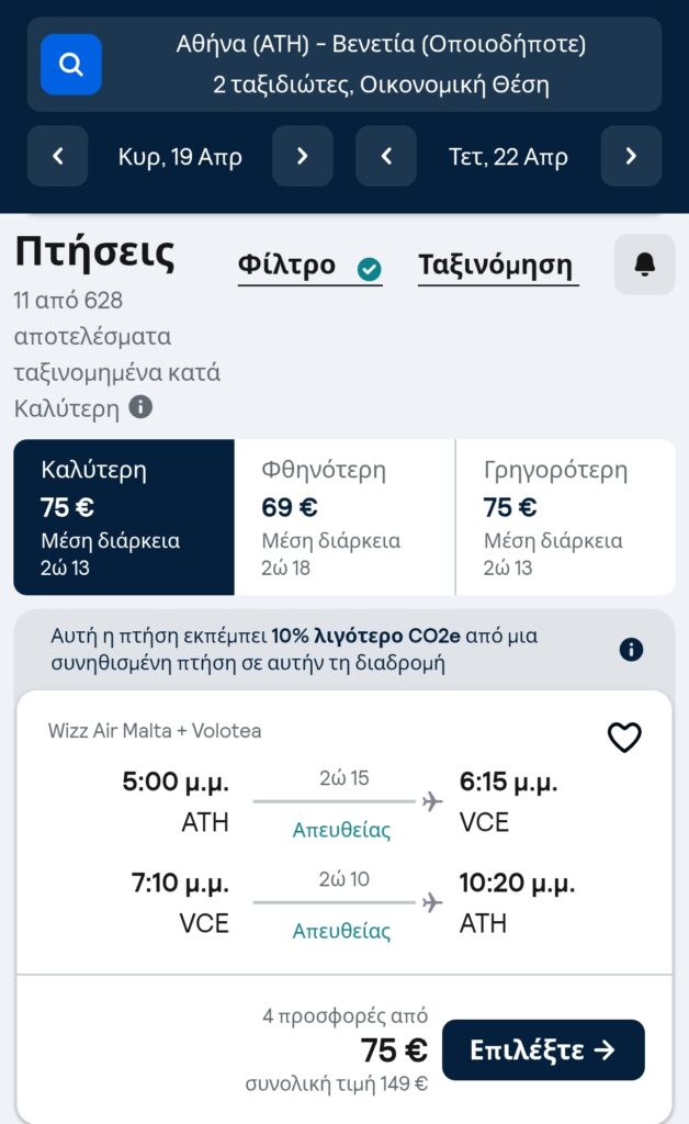 - Η παραπάνω τιμή ισχύει σήμερα (18/2/26) κι ενδέχεται να αλλάξει όσο περνάνε οι ώρες, αφού οι τιμές των αεροπορικών εισιτηρίων δεν παραμένουν σταθερές για πολλές ώρες.