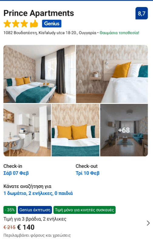 Για τη διαμονή σας εντοπίσαμε τα διαμερίσματα Prince Apartments, που βρίσκονται κοντά στο κέντρο της Βουδαπέστης, με εύκολη πρόσβαση στις δημόσιες άριστες συγκοινωνίες της Βουδαπέστης, όπως το τραμ και το μετρό. Από την εφαρμογή της booking, που προσφέρει καλύτερη τιμή, για 3 βράδια, το κόστος ενός δίκλινου studio είναι 140€ ή 155€ με δωρεάν ακύρωση της κράτησης έως 3 μέρες πριν το ταξίδι. Η αξιολόγησή του είναι 8,7/10.