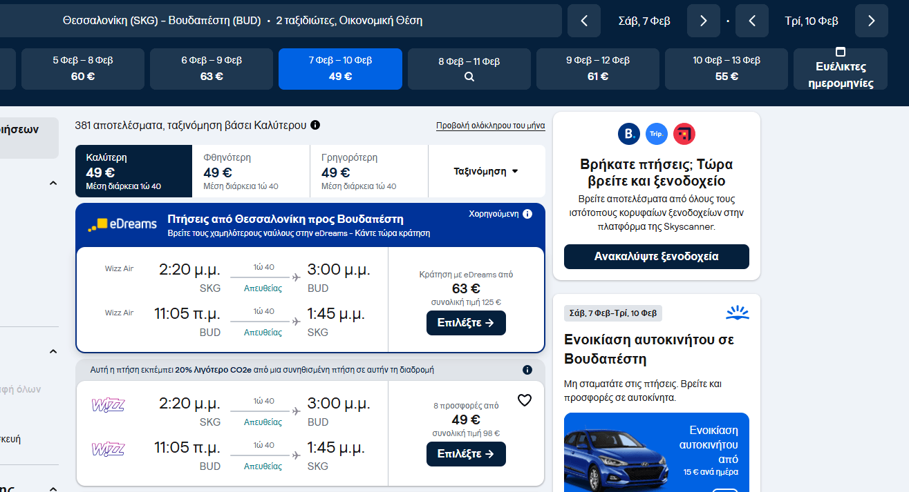 Το κόστος είναι 98€ με επιστροφή για δύο άτομα με Wizzair.