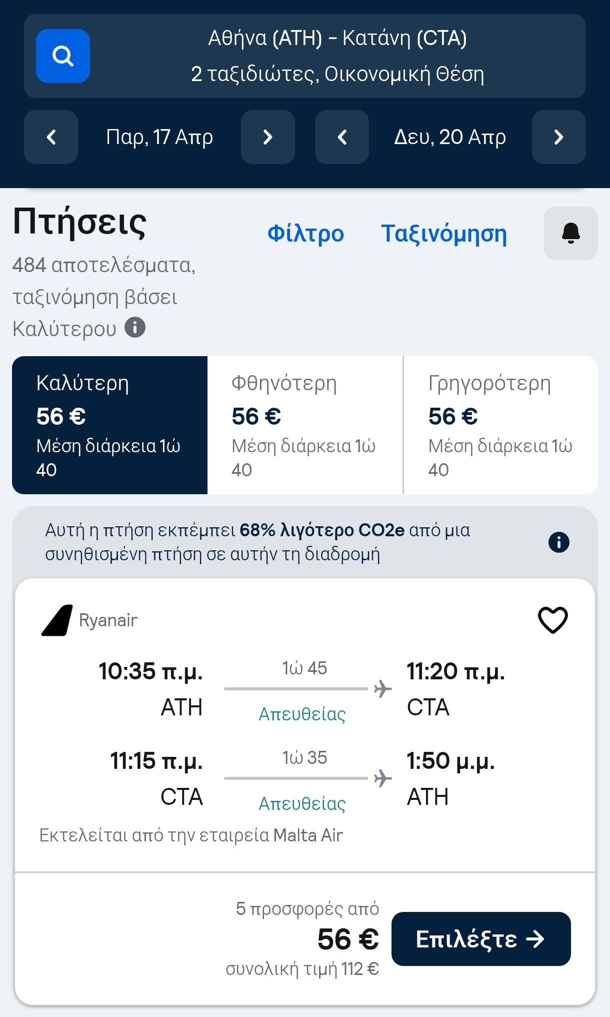 Η συνολική τιμή είναι 112€ με επιστροφή για δύο άτομα με Ryanair.