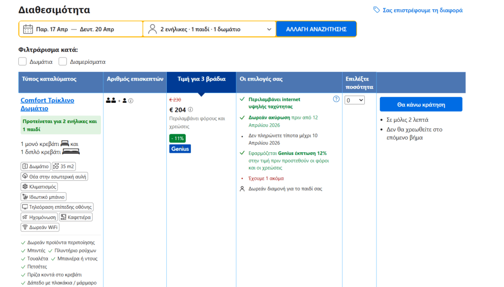 *Για να σας εμφανίζεται η τιμή που βλέπουμε, πρέπει να κάνετε σύνδεση στο site της Booking. Είναι δωρεάν και γίνεται απευθείας μέσω gmail.