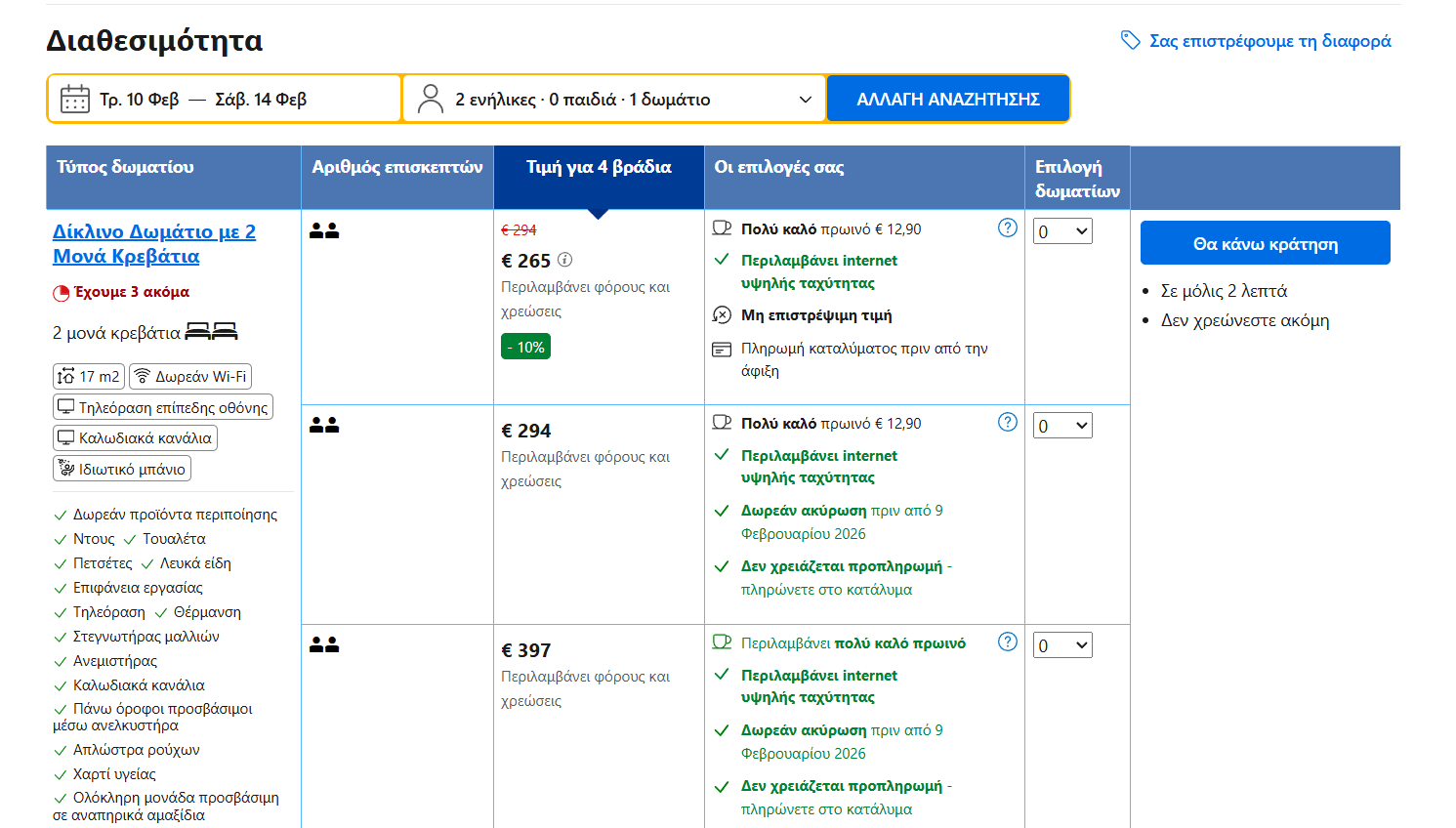 *Για να σας εμφανίζεται η τιμή που βλέπουμε, πρέπει να κάνετε σύνδεση στο site της Booking. Είναι δωρεάν και γίνεται απευθείας μέσω gmail.