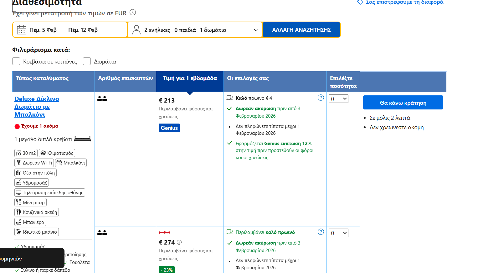 Για να σας εμφανίζεται η τιμή που βλέπουμε στο booking, να μην ξεχνάτε να κάνετε log in, ώστε να ενεργοποιούνται οι genius εκπτώσεις.