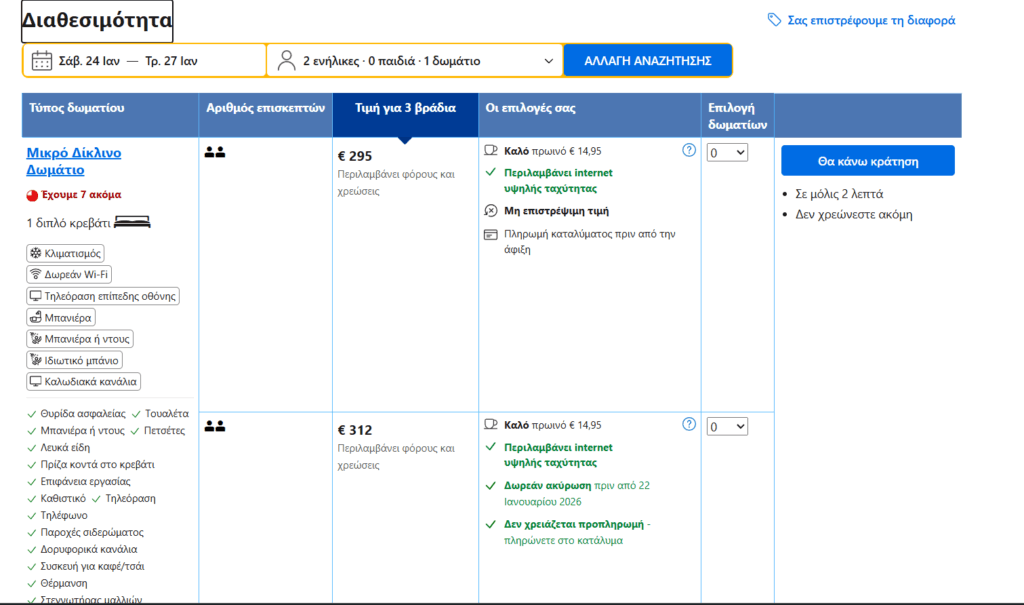 *Για να σας εμφανίζεται η τιμή που βλέπουμε, πρέπει να κάνετε σύνδεση στο site της Booking. Είναι δωρεάν και γίνεται απευθείας μέσω gmail.