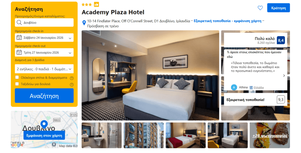 Για τη διαμονή σας στο ακριβό Δουβλίνο εντοπίσαμε το ξενοδοχείο 3*Academy Plaza Hotel, που βρίσκεται στο κέντρο του Δουβλίνου. Το κόστος ενός δίκλινου δωματίου για 3 βράδια είναι 295€ ή 312€ με δωρεάν ακύρωση της κράτησης έως 2 ημέρες πριν το ταξίδι. Η αξιολόγησή του στην booking είναι 8.4/10.