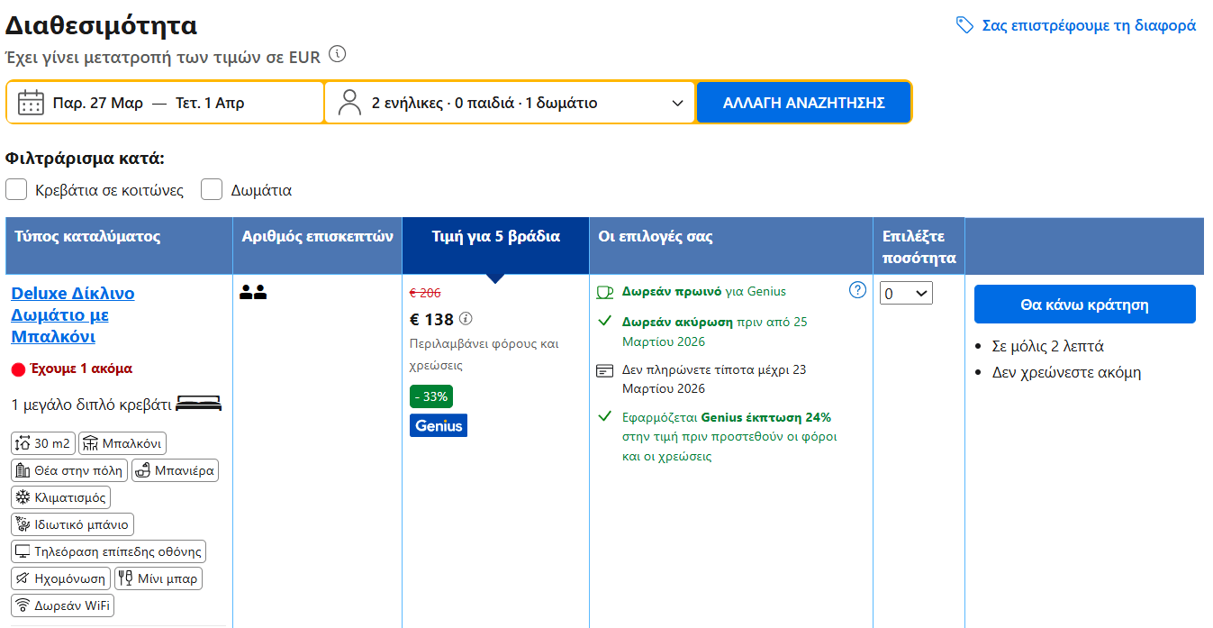 Για να σας εμφανίζεται η τιμή που βλέπουμε στο booking, να μην ξεχνάτε να κάνετε log in, ώστε να ενεργοποιούνται οι genius εκπτώσεις.