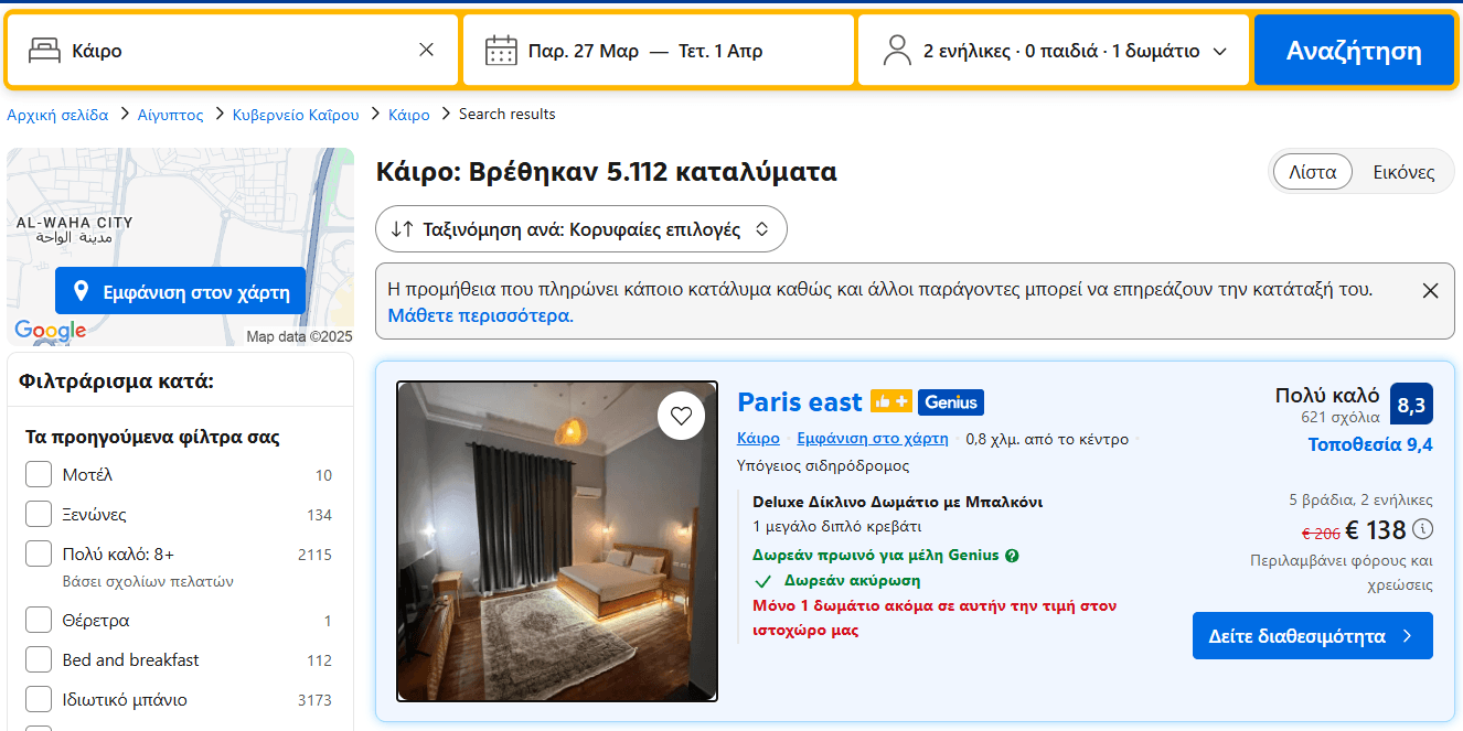 Για value for money διαμονή στο Κάιρο σας προτείνουμε το κατάλυμα Paris East, που βρίσκεται στο κέντρο του Καΐρου. Για 5 βράδια, το κόστος για 2 άτομα είναι 156€ με πρωινό. Η αξιολόγησή του στην booking είναι 8.4/10.