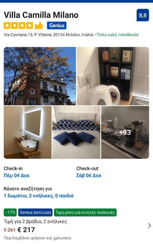 Για τη διαμονή σας στο ακριβό Μιλάνο, προτείνουμε το κατάλυμα Villa Camilla Milano. Δεν βρίσκεται στο κέντρο του Μιλάνου, αλλά πολύ κοντά σε σταθμό μετρό. Από την εφαρμογή της booking, που προσφέρει καλύτερη τιμή, για 2 βράδια κοστίζει 217€ ή 238€ με δυνατότητα δωρεάν ακύρωσης της κράτησης έως 2 βδομάδες πριν το ταξίδι. Η αξιολόγησή του είναι 8,8/10.