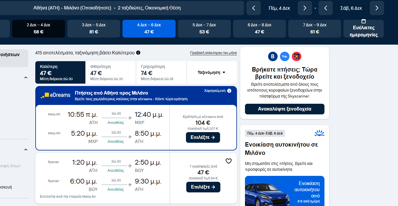Μπείτε στο site της Skyscanner κι αναζητήστε τις πτήσεις όπως φαίνονται στο screenshot.