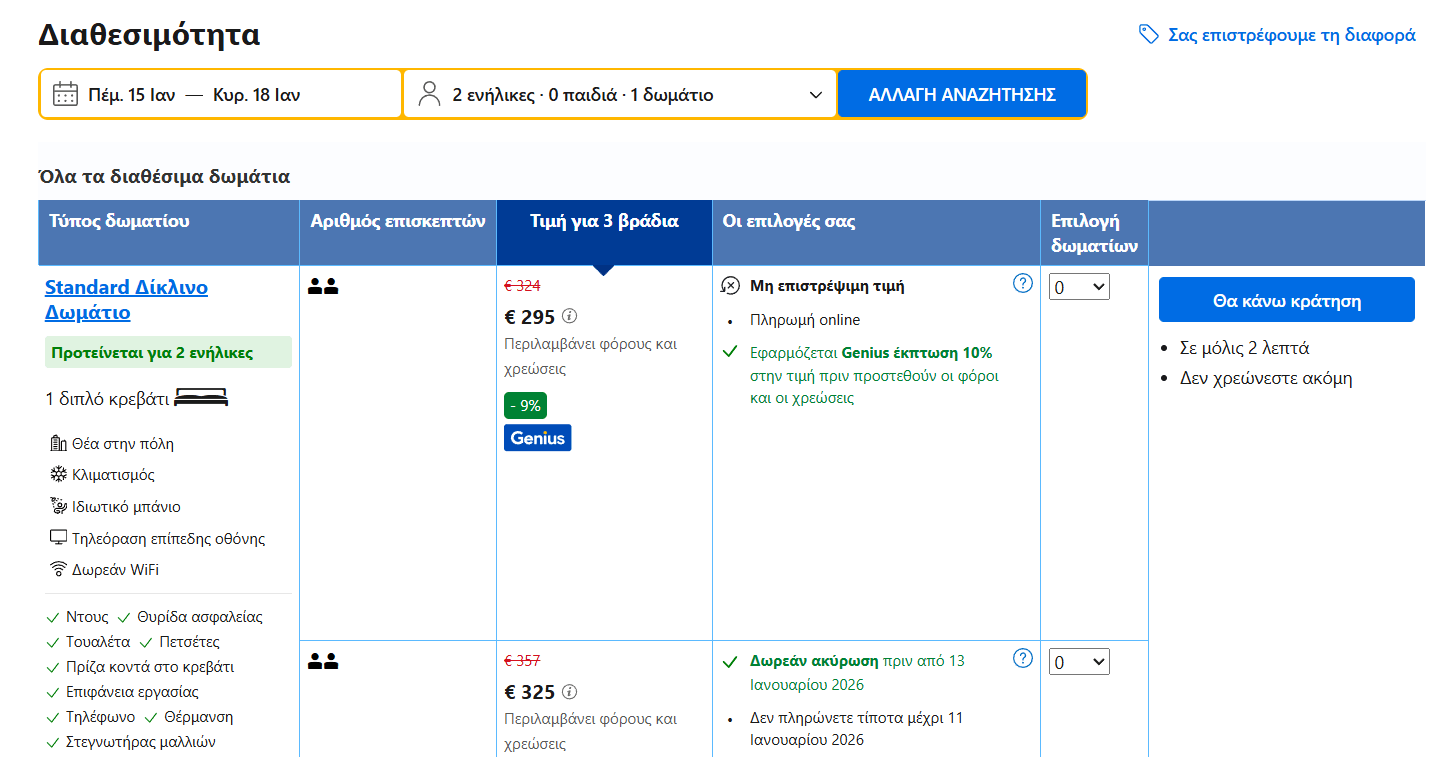 *Για να σας εμφανίζεται η τιμή που βλέπουμε, πρέπει να κάνετε σύνδεση στο site της Booking. Είναι δωρεάν και γίνεται απευθείας μέσω gmail.