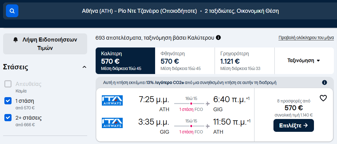 Οι πτήσεις είναι με την ιταλική αεροπορική ITA Airways και κοστίζουν από 1140€ για 2 άτομα με επιστροφή, με ανταπόκριση στη Ρώμη 1,50′ και 2,15′ αντίστοιχα.