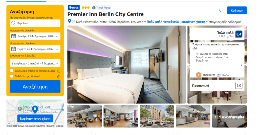 Για τη διαμονή σας εντοπίσαμε το ξενοδοχείο Premier Inn Berlin City Centre hotel, που βρίσκεται σχετικά κοντά στο κέντρο του Βερολίνου, και μια ανάσα από σταθμό μετρό. Για 3 βράδια, το δίκλινο κοστίζει 186€ ή 239€ με δωρεάν ακύρωση της κράτησης έως την ημέρα του ταξιδιού. Η αξιολόγησή του στην booking είναι 8.4/10.