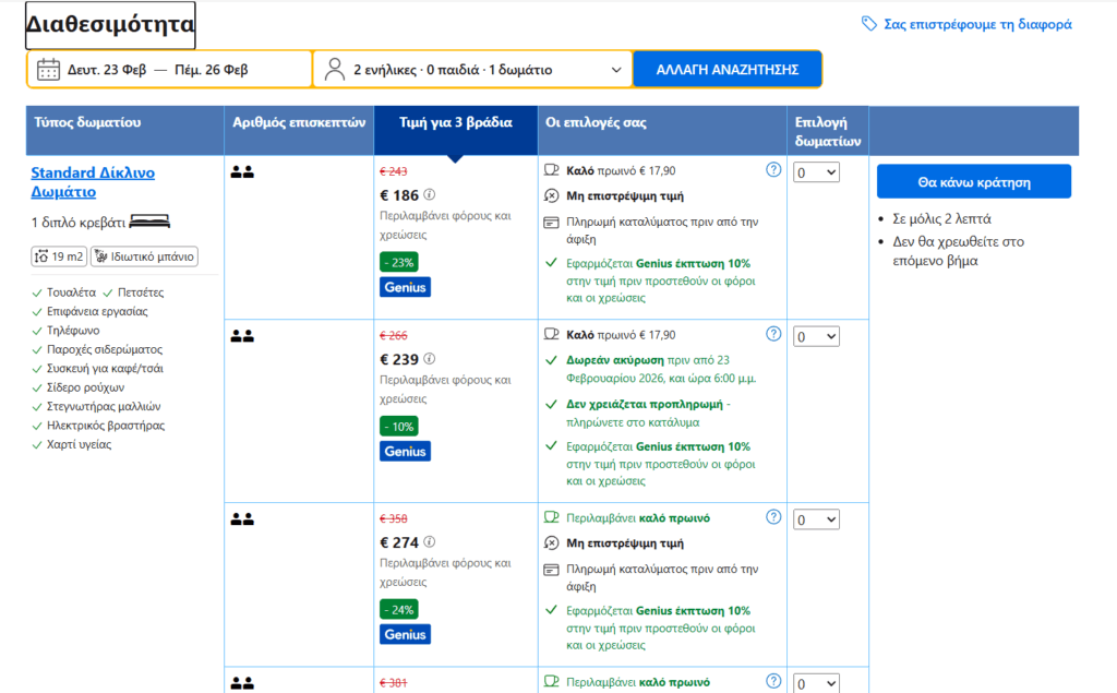 *Για να σας εμφανίζεται η τιμή που βλέπουμε, πρέπει να κάνετε σύνδεση στο site της Booking. Είναι δωρεάν και γίνεται απευθείας μέσω gmail.