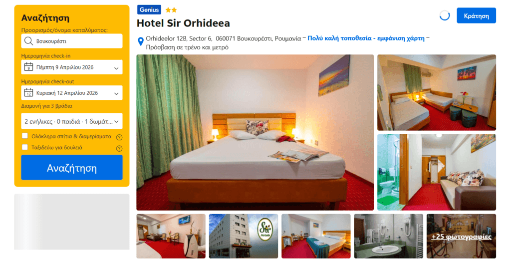 Για τη διαμονή σας εντοπίσαμε το ξενοδοχείο 2* Hotel Sir Orhideea, που βρίσκεται κοντά στο κέντρο του Βουκουρεστίου, έχοντας εύκολη πρόσβαση στις συγκοινωνίες. Το κόστος ενός δωματίου για 4 βράδια είναι 133€ με δυνατότητα δωρεάν ακύρωσης έως 1 μέρα πριν το ταξίδι. Το συγκεκριμένο δωμάτιο είναι δίκλινο (2 μονά κρεβάτια). Υπάρχει και διαθεσιμότητα δωματίων με διπλό κρεβάτι με μικρή διαφορά τιμής. Η αξιολόγησή του στην booking είναι 8.6/10.