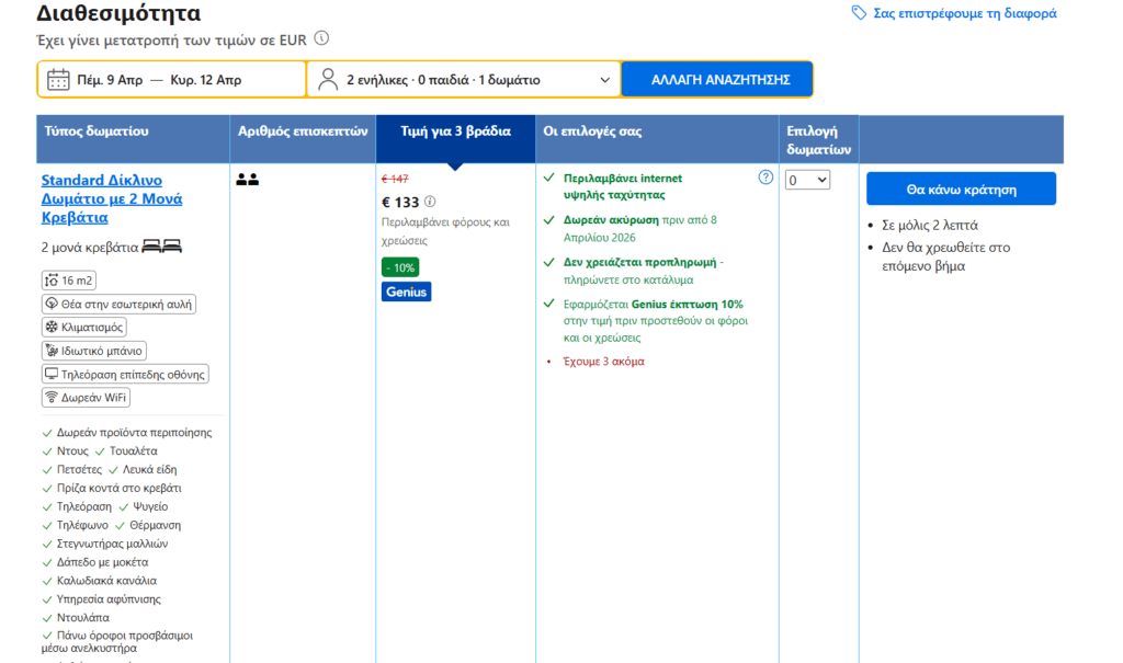 *Για να σας εμφανίζεται η τιμή που βλέπουμε, πρέπει να κάνετε σύνδεση στο site της Booking. Είναι δωρεάν και γίνεται απευθείας μέσω gmail.