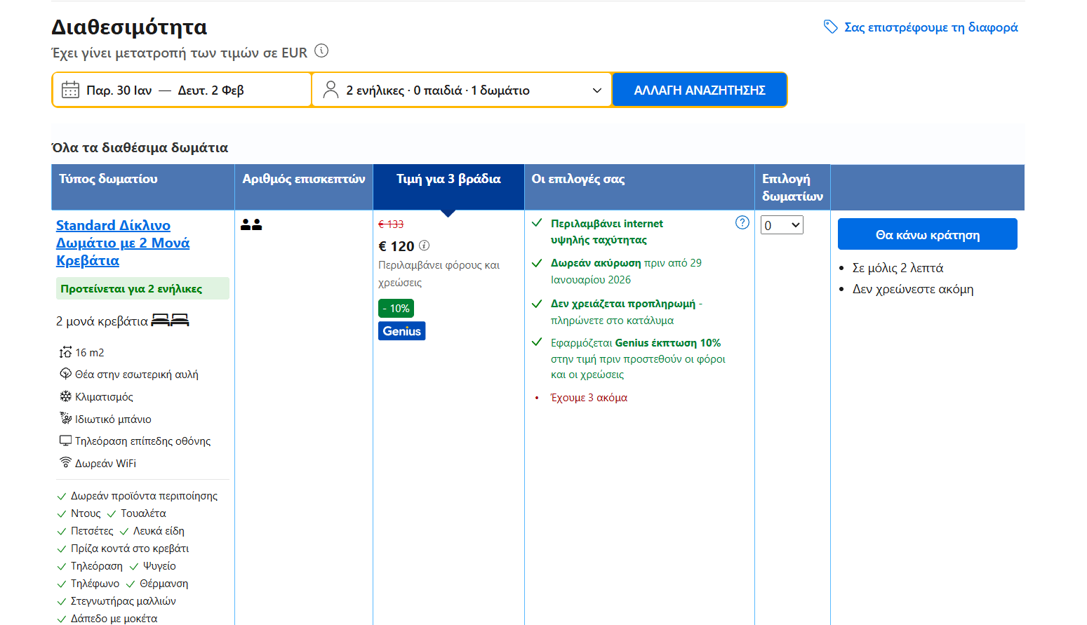 *Για να σας εμφανίζεται η τιμή που βλέπουμε, πρέπει να κάνετε σύνδεση στο site της Booking. Είναι δωρεάν και γίνεται απευθείας μέσω gmail.