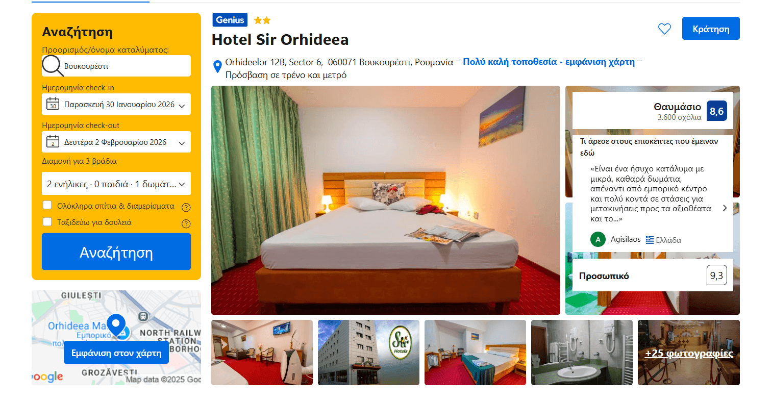 Για τη διαμονή σας εντοπίσαμε το ξενοδοχείο 2* Hotel Sir Orhideea, που βρίσκεται κοντά στο κέντρο του Βουκουρεστίου, έχοντας εύκολη πρόσβαση στις συγκοινωνίες. Το κόστος ενός δωματίου για 3 βράδια είναι 120€ με δυνατότητα δωρεάν ακύρωσης έως 1 μέρα πριν το ταξίδι. Το συγκεκριμένο δωμάτιο είναι δίκλινο (2 μονά κρεβάτια). Υπάρχει και διαθεσιμότητα δωματίων με διπλό κρεβάτι με μικρή διαφορά τιμής. Η αξιολόγησή του στην booking είναι 8.6/10.