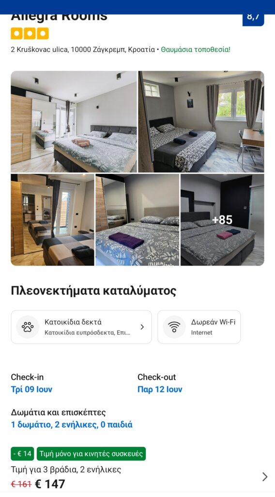 Για τη διαμονή σας εντοπίσαμε το κατάλυμα Allegra Rooms, που βρίσκεται κοντά σε στάση λεωφορείου και τραμ για την πόλη του Ζάγκρεμπ. Από την εφαρμογή της booking, που προσφέρει καλύτερη τιμή, το κόστος ενός δωματίου 2 ατόμων για 3 βράδια είναι 147€. Η αξιολόγησή του είναι 8.8/10.
