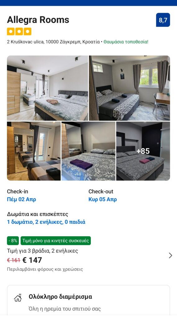 Για τη διαμονή σας εντοπίσαμε το κατάλυμα Allegra Rooms, που βρίσκεται κοντά σε στάση λεωφορείου και τραμ για την πόλη του Ζάγκρεμπ. Από την εφαρμογή της booking, που προσφέρει καλύτερη τιμή, το κόστος ενός δωματίου 2 ατόμων για 3 βράδια είναι 147€. Η αξιολόγησή του είναι 8.8/10.