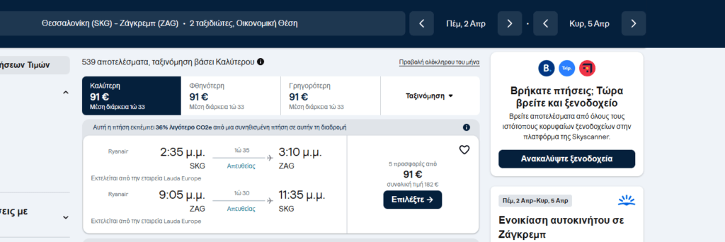 Μπείτε στο site της Skyscanner κι αναζητήστε τις πτήσεις όπως φαίνονται στο screenshot:
