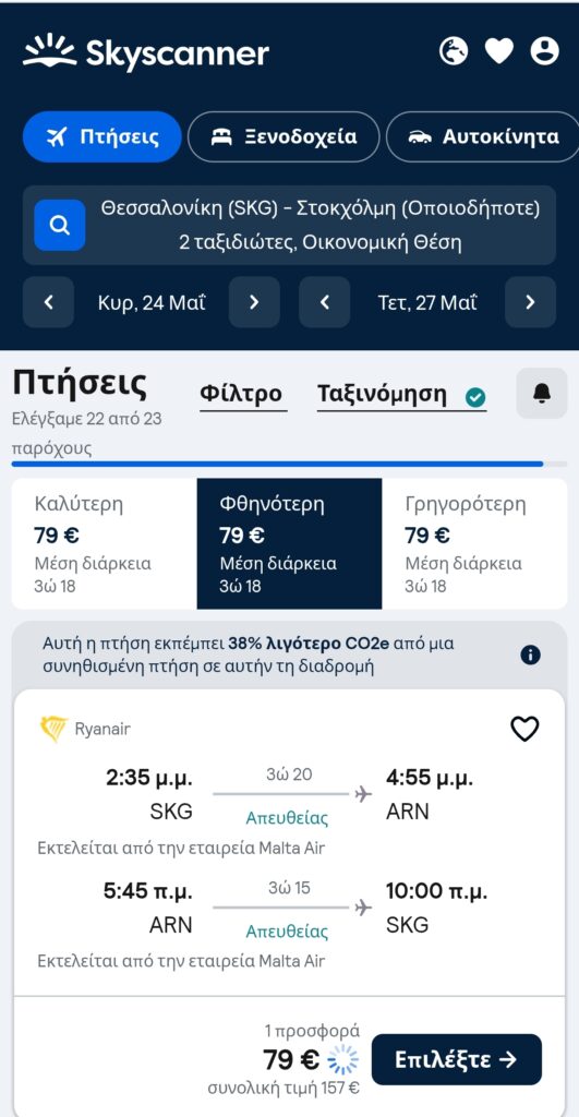 Η συνολική τιμή είναι 157 ευρώ για δύο άτομα με επιστροφή με Ryanair.